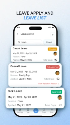 Met Orkmanza behoort gissen tot het verleden. Een geavanceerd systeem voor realtime aanwezigheidsregistratie biedt direct inzicht in de teamstatus. Het indienen en goedkeuren van verlofaanvragen is nog nooit zo eenvoudig geweest, dankzij een intuïtief proces dat snelle beslissingen mogelijk maakt. Bovendien optimaliseert de app het taak- en tijdbeheer, waardoor de algehele productiviteit aanzienlijk toeneemt en medewerkers zich kunnen concentreren op hun kerntaken. Van gedetailleerde vergaderschema's tot punctuele herinneringen, Orkmanza zorgt ervoor dat geen enkele belangrijke afspraak wordt gemist.