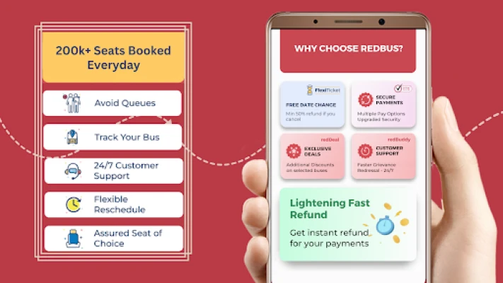 Naast het omvangrijke busaanbod fungeert redBus ook als uw geautoriseerde IRCTC-partner via redRail voor al uw treinreizen, compleet met PNR-statuscontroles en live updates van de treinlocatie. En om uw reis compleet te maken, kunt u via redBus voordelige hotelovernachtingen boeken in meer dan 2000 steden, met toegang tot een netwerk van meer dan 30.000 geverifieerde accommodaties. Geniet bovendien van de extra connectiviteit via uw Wear OS smartwatch, waarmee u actieve reizen kunt volgen en real-time meldingen ontvangt, zodat u altijd perfect geïnformeerd bent. Voor elke vraag staat onze 24/7 klantenservice klaar om u te ondersteunen.